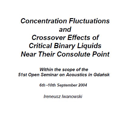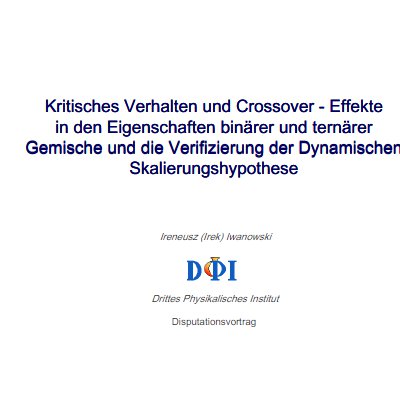 I. Iwanowski; Verifizierung der dynamischen Skalierungshypothese mittels Ultraschallspektroskopie und quasielastischer Lichtstreuung / Das binäre kritische System Nitromethan/Pentanol; Diplomarbeit – Georg August Universität Göttingen (2003)