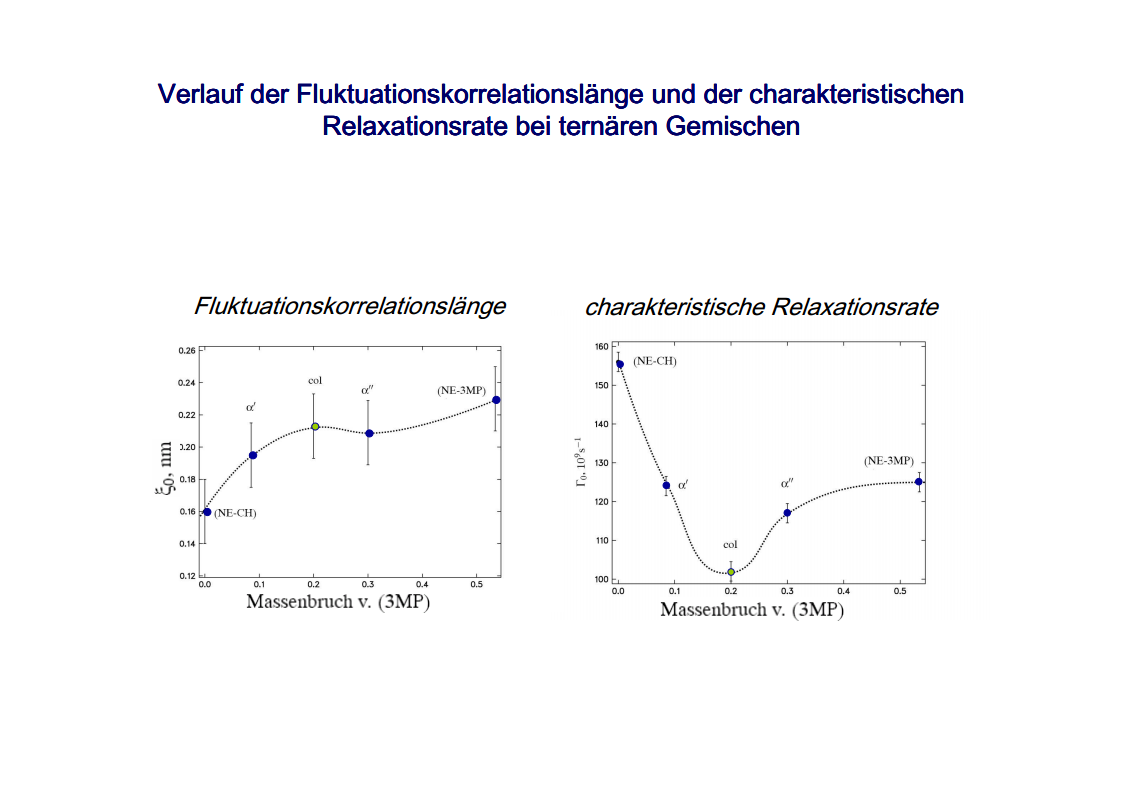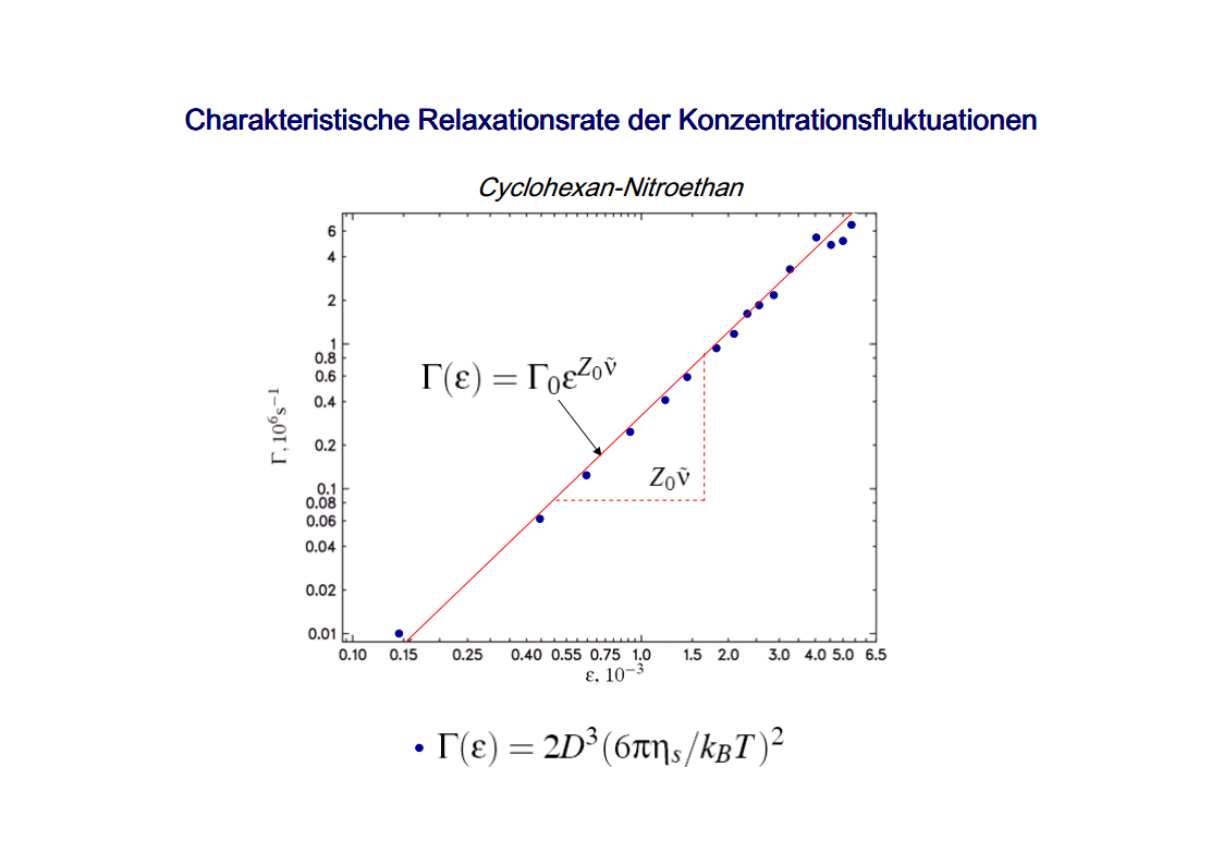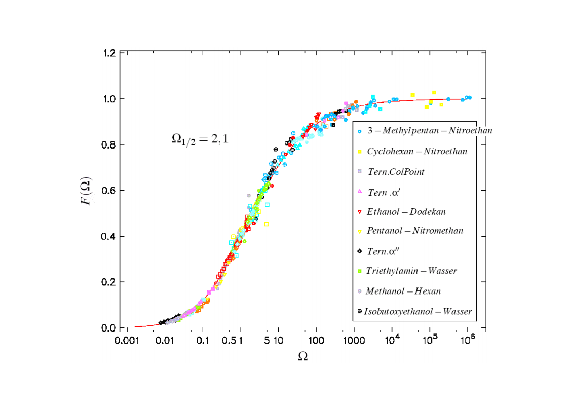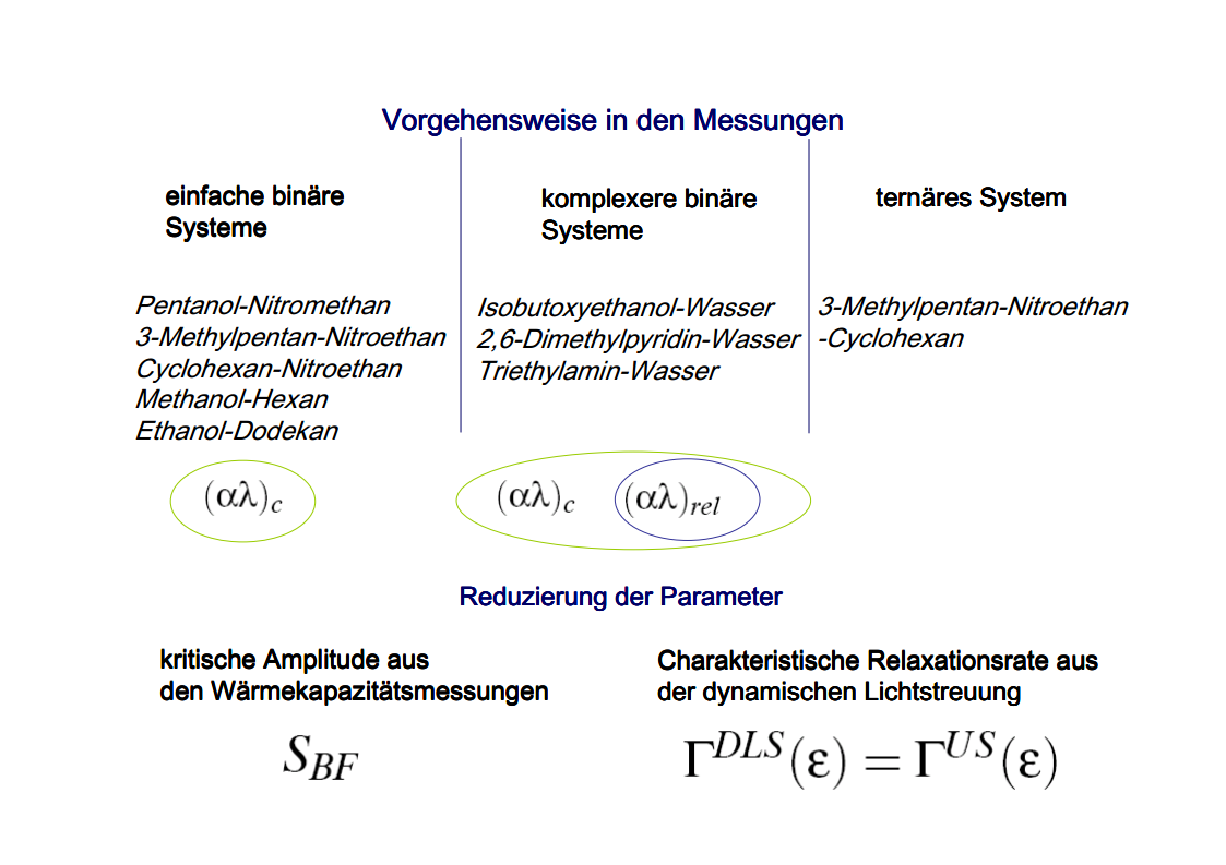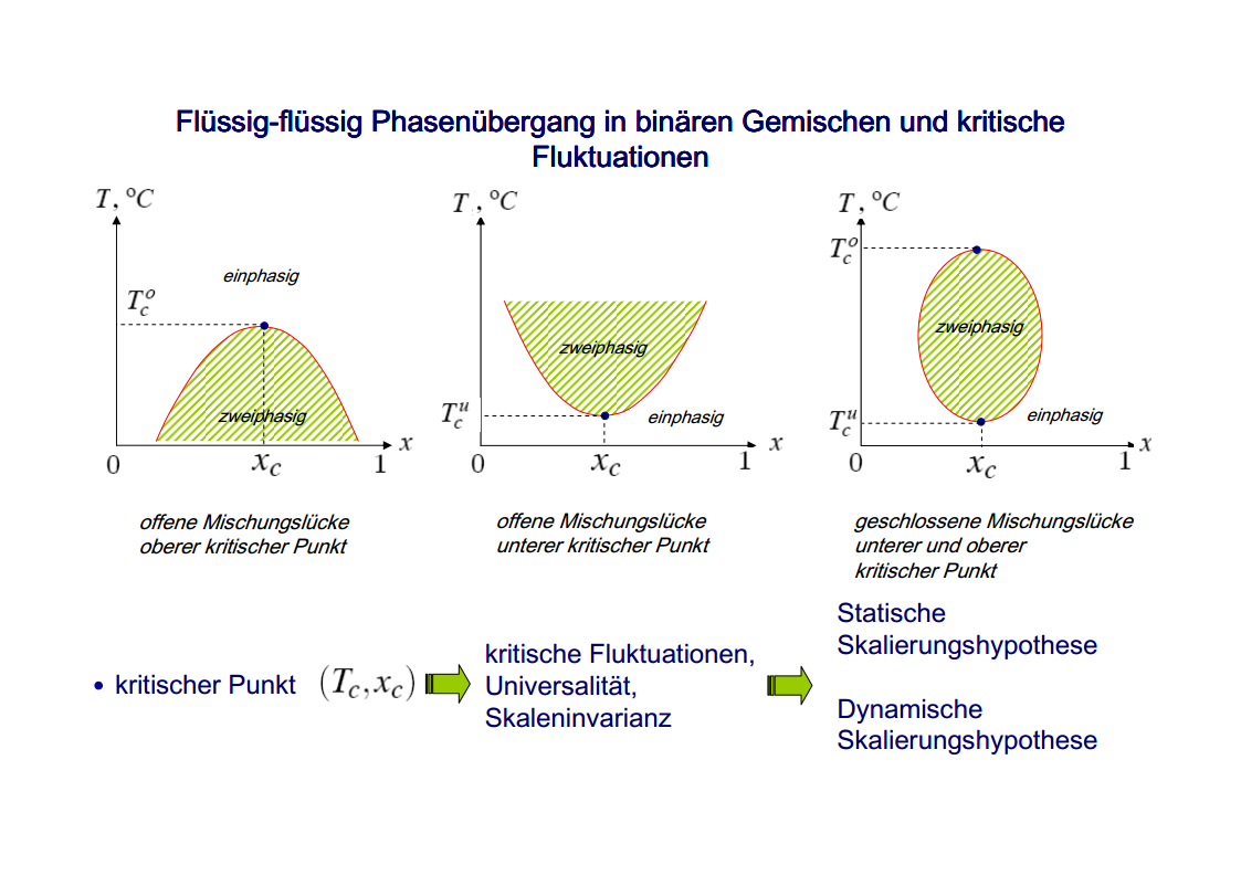 The focus of those investigations were the critical phenomena, in particular the critical slowing down of the phase separation near the critical point of binary colloid-polymer mixtures in a micro gravity environment. The aim of such investigations was to develop fundamental physical concepts previously which had so far been masked by gravity effects. A first qualitative description of the critical behavior of some special systems was already given at the beginning of last century. Examples are liquid/gas transition and the ferro/paramagnetism transition. An essential step towards a deeper understanding of critical behavior was made by Landau’s general theory of phase transitions. Later the theory has been further developed by Onsager, which found the exact solution for the thermodynamic properties of a two-dimensional Ising model, that had been frequently discussed. It was a great surprise to find the theory of Landau to fail completely in predicting the behavior close to the critical point. Fisher, played a leading role by his analysis of experimental data, combining theoretical analysis and numerical calculations. Important theoretical contributions have been made by Widom, Patashinskii and Pokrovski, and most important by Kadanoff. Kadanoff put forward a very important new and original idea which seemed to have a strong influence on the later development of the field. However, his theory did not allow to calculate the critical behavior. The problem was solved in a comprehensive and profound way by Wilson. Wilson was the first to realize that critical phenomena are different from most other phenomena in physics in that close to the critical point one has to deal with fluctuations over widely different scales of length. Nevertheless, investigations which have been performed on critical system have indicated the description of their behavior is not sufficient for a wide temperature range. The range between the background and mean-field behavior could not be described satisfactorily by classic theories of critical phenomena. Consequently, a new formalism has been developed by Albright, Burstyn, Sengers, Bhattacharjee and Ferrell, to describe the range between the consolute point and background behavior. This formalism is named crossover theory.The ideas of universality appear to be also applicable to phase transitions in complex fluids like polymers and polymer solutions, micro-emulsions and liquid crystals, fluids in porous media as well as phospholipid bilayer vesicle solutions. Besides dynamic light scattering an important measurement method to study the cooperative effects in complex fluids is the broad band ultrasonic spectroscopy. Being a non-destructive technique it allows for the measurement of chemical relaxations as well as critical fluctuations. During the past decades various theories have been developed to treat the critical slowing down of the critical ultrasonic attenuation in binary liquids within the framework of the dynamic scaling theory. The most prominent examples of the dynamic scaling theory have been presented by Bhattacharjee and Ferrell. Folk and Moser developed a renormalization group theory of the mode-coupling model and Onuki derived a model from an intuitive description of the bulk viscosity near the critical point. The verification, with the aid of dynamic light scattering and shear viscosity measurements as well as with broad band ultrasonic measurements, of the validity of these dynamic scaling functions of various critical mixtures was one of the aims of the present thesis. Essential quantities are the characteristic relaxation time Γ, the fluctuations correlation length ξ, the mutual diffusion coefficient D, as well as the reduced half-attenuation frequency Ω1/2 , the adiabatic coupling constant g, and the critical amplitude S of the ultrasonic attenuation spectra. Also considered was the coupling between the critical contributions and the noncritical relaxations due to chemical processes, as well as the predictions by Procaccia et al., on the critical slowing of those chemical reactions which might occur when a system is approaching its critical demixing point. An additional emphasis of studies of binary mixtures was the verification of the before mentioned crossover theory, with cut-off wave numbers qc and qD as substantial parameters. Investigations on ternary mixtures with different compositions along the plait line were performed to determine the validity of the dynamic scaling hypothesis, especially the dependence of critical quantities on the concentration of the additional third component. With the ternary mixtures special attention has been paid to the crossover behavior, which had been first considered for binary systems.