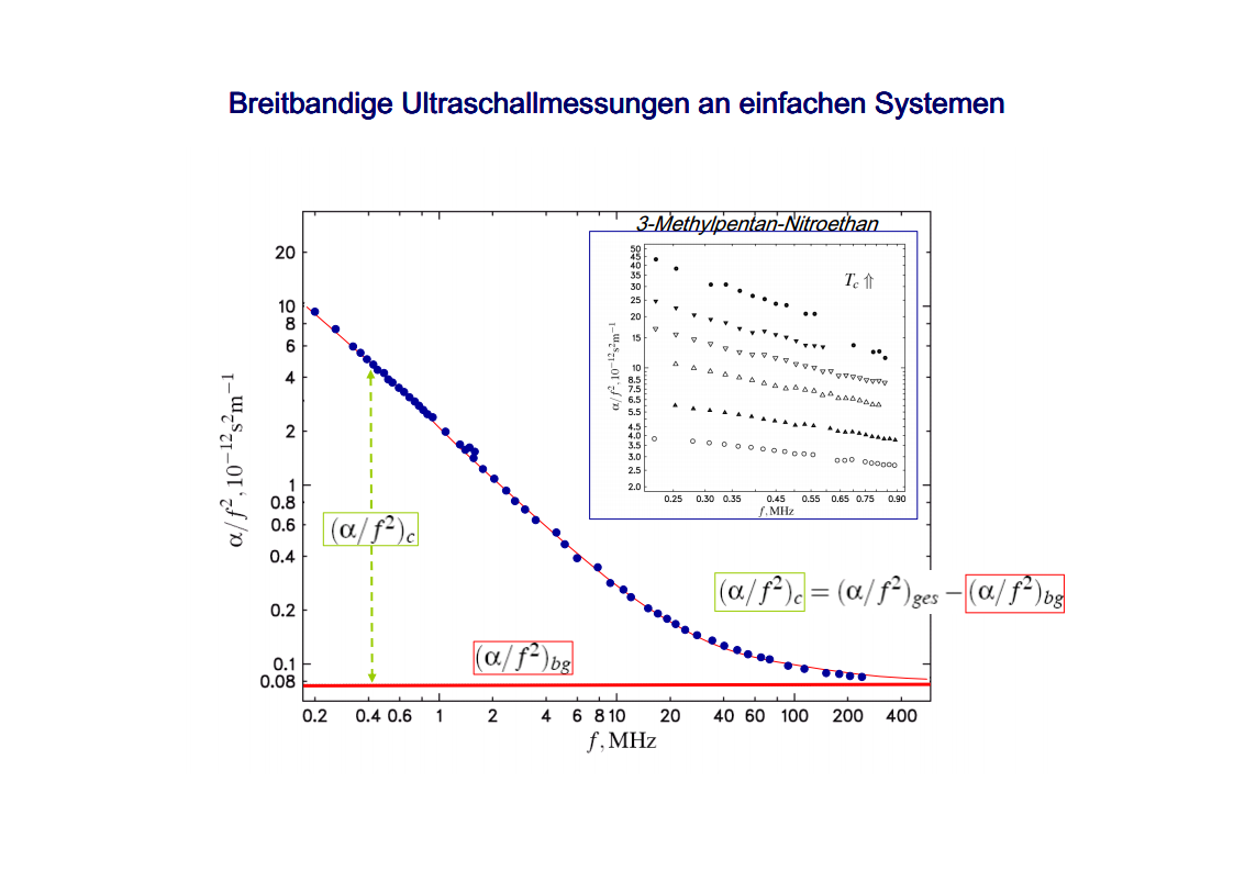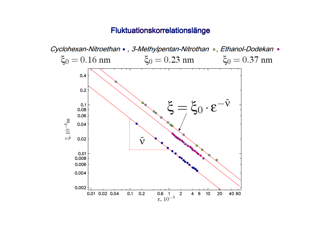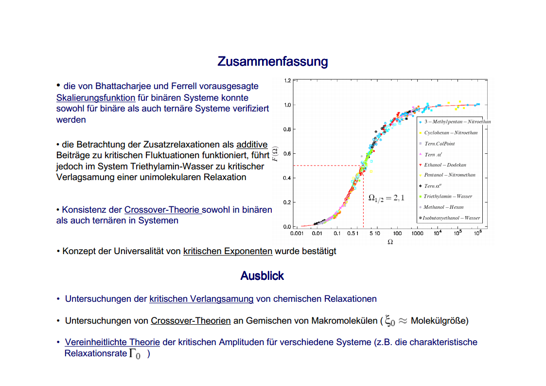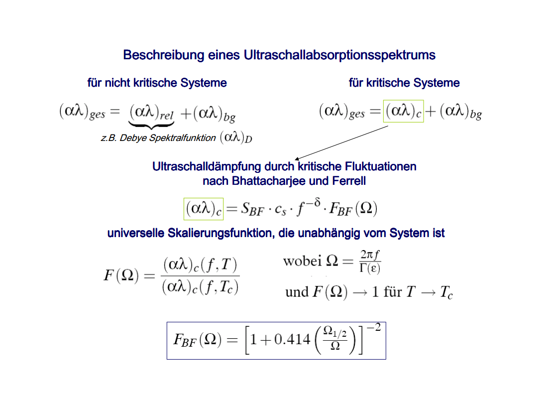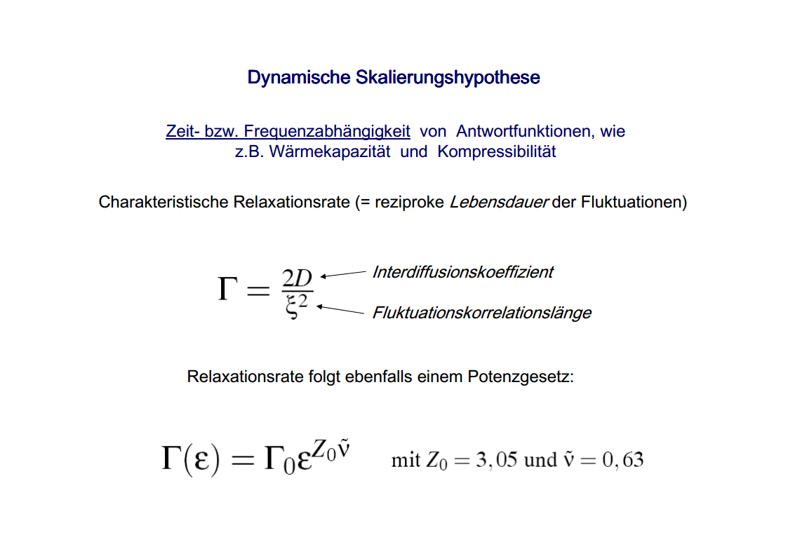 The focus of those investigations were the critical phenomena, in particular the critical slowing down of the phase separation near the critical point of binary colloid-polymer mixtures in a micro gravity environment. The aim of such investigations was to develop fundamental physical concepts previously which had so far been masked by gravity effects. A first qualitative description of the critical behavior of some special systems was already given at the beginning of last century. Examples are liquid/gas transition and the ferro/paramagnetism transition. An essential step towards a deeper understanding of critical behavior was made by Landau’s general theory of phase transitions. Later the theory has been further developed by Onsager, which found the exact solution for the thermodynamic properties of a two-dimensional Ising model, that had been frequently discussed. It was a great surprise to find the theory of Landau to fail completely in predicting the behavior close to the critical point. Fisher, played a leading role by his analysis of experimental data, combining theoretical analysis and numerical calculations. Important theoretical contributions have been made by Widom, Patashinskii and Pokrovski, and most important by Kadanoff. Kadanoff put forward a very important new and original idea which seemed to have a strong influence on the later development of the field. However, his theory did not allow to calculate the critical behavior. The problem was solved in a comprehensive and profound way by Wilson. Wilson was the first to realize that critical phenomena are different from most other phenomena in physics in that close to the critical point one has to deal with fluctuations over widely different scales of length. Nevertheless, investigations which have been performed on critical system have indicated the description of their behavior is not sufficient for a wide temperature range. The range between the background and mean-field behavior could not be described satisfactorily by classic theories of critical phenomena. Consequently, a new formalism has been developed by Albright, Burstyn, Sengers, Bhattacharjee and Ferrell, to describe the range between the consolute point and background behavior. This formalism is named crossover theory.The ideas of universality appear to be also applicable to phase transitions in complex fluids like polymers and polymer solutions, micro-emulsions and liquid crystals, fluids in porous media as well as phospholipid bilayer vesicle solutions. Besides dynamic light scattering an important measurement method to study the cooperative effects in complex fluids is the broad band ultrasonic spectroscopy. Being a non-destructive technique it allows for the measurement of chemical relaxations as well as critical fluctuations. During the past decades various theories have been developed to treat the critical slowing down of the critical ultrasonic attenuation in binary liquids within the framework of the dynamic scaling theory. The most prominent examples of the dynamic scaling theory have been presented by Bhattacharjee and Ferrell. Folk and Moser developed a renormalization group theory of the mode-coupling model and Onuki derived a model from an intuitive description of the bulk viscosity near the critical point. The verification, with the aid of dynamic light scattering and shear viscosity measurements as well as with broad band ultrasonic measurements, of the validity of these dynamic scaling functions of various critical mixtures was one of the aims of the present thesis. Essential quantities are the characteristic relaxation time Γ, the fluctuations correlation length ξ, the mutual diffusion coefficient D, as well as the reduced half-attenuation frequency Ω1/2 , the adiabatic coupling constant g, and the critical amplitude S of the ultrasonic attenuation spectra. Also considered was the coupling between the critical contributions and the noncritical relaxations due to chemical processes, as well as the predictions by Procaccia et al., on the critical slowing of those chemical reactions which might occur when a system is approaching its critical demixing point. An additional emphasis of studies of binary mixtures was the verification of the before mentioned crossover theory, with cut-off wave numbers qc and qD as substantial parameters. Investigations on ternary mixtures with different compositions along the plait line were performed to determine the validity of the dynamic scaling hypothesis, especially the dependence of critical quantities on the concentration of the additional third component. With the ternary mixtures special attention has been paid to the crossover behavior, which had been first considered for binary systems.