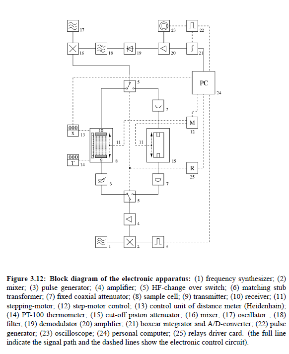 The full lines ndicate the signal path and the dashed lines show the electronic control circuit. The frequency synthesizer (1) along with the pulse generator (3) and the mixer (2) generates a pulse-modulated HF signal with frequency of measurement f. The signal, via two coaxial HF-switches, is passed either through the measuring branch or the reference branch of the comparator circuit. After passing the sample cell or the below-cut-off piston attenuator, both signals are fed via HF change over switch (5) to a superheterodyne receiver (16-20). A boxcar integrator (21) adds up the signal over a sequence of 400 pulses. Finally, the result is transferred to a personal computer and evaluated using the data of length l, measured by the digital distance meter (11) with control unit (13). The temperature is measured with a Pt-100 thermometer (14).