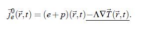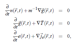 with the particle number density n(~r ,t ), the vector of momentum density g~(~r ,t ), the m mass, as well as the energy density e(~r ,t ). T (~r ,t ) is the stress tensor and j e (~r ,t ) the energy flux density. Finally, the expression of energy flux density is given by: