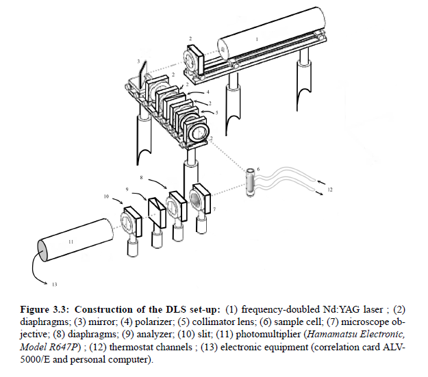 A typical dynamic light scattering set-up is presented in Fig.(3.3). A frequency-doubled Nd:YAG laser (1) is used as light source. The laser light passes several diaphragms (2), a polarizer (4) and a collimator lens (5) with focal length f = 100 mm and is then fed to the sample cell (6). The scattered light passes a microscope objective (7), a polarization analyzer (9) and the slit (10) with (d = 200 µm). Finally, the signal is detected by a photomultiplier (Hamamatsu Electronic, Model R647P) (12) that transforms a variation of intensity into a variation of voltage. The spectrometer is provided with a goniometer system which allow superior of scattering angle Θ. The received signal is analyzed with help of a correlation card ALV-5000/E with logarithmic timescale and with 288 channels. In principle it is possible to analyze the autocorrelation function in terms of a superposition of up to four exponentials and thus four correlation times τ . Hence the Rayleigh line