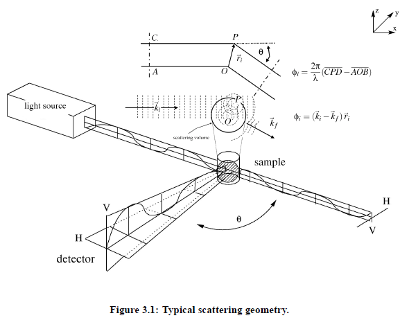 In principle, it is possible to vary the polarization of the incident light. However, with the help of scattering vector q~ follows from geometrical considerations, Fig.(3.1), the relationship between the wave vector ki that points in the direction of the incident plane wave, and kf which points in the direction of the outgoing waves .The scattering vector is defined as q~ = k −k . The amount of q~ is given by: