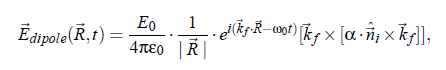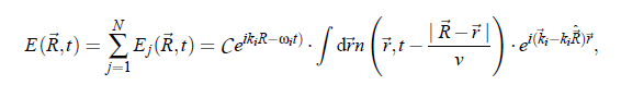 with the electric field constant ε , and with R being the position of the detector. This eqation describes the electric field propagating from an elementary dipole originating from a molecule. The electrical field from all molecules in the scattering volume follows as: