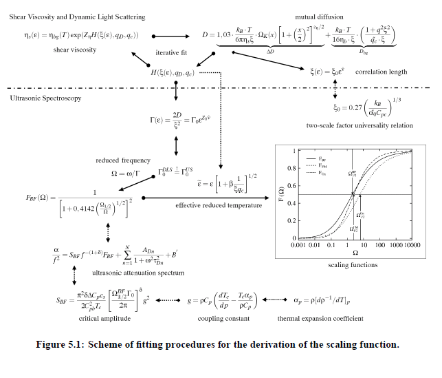 The formalism for the verification of the critical parameters and the scaling function calls for a specific treatment of experimental data within the framework of crossover formalisms as well as the Bhattacharjee-Ferrell theory of critical sound attenuation, Fig.(5.1). In principle, the scaling function can be derived directly from the ultrasonic measurements, by taking into account the Bhattacharjee-Ferrell theory. However, due to effects of critical slowing near T_c as well as the enormously increasing attenuation coefficient toward low frequencies, only the high frequency part of the critical contribution to the ultrasonic spectra is obtainable from attenuation coefficient measurements.Therefore Γ_US is only inaccurately known from acoustical spectrometry. For this reason and in order to reduce the number of unknown parameters in ultrasonic spectroscopy, the relaxation rate of order-parameter fluctuations has been additionally determined by shear viscosity and mutual diffusion coefficient measurements. Consequently, no distinction between the relaxation rate of critical fluctuations from ultrasonic measurements, Γ_US, and that from dynamic light scattering,Γ_DLS , will be made in the following:
