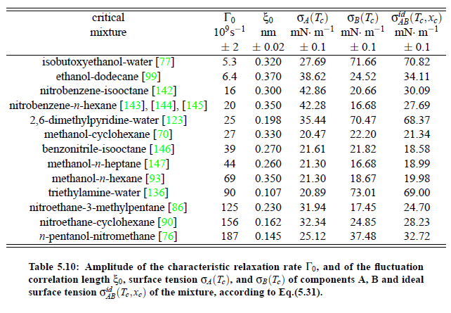 Parameters which have been obtained from ultrasonic spectrometry, dynamic light scattering and shear viscosity are presented in Table (5.9). It is a fascinating aspect of the dynamic scaling theory of ultrasonic attenuation that, due to scaling of frequency data of different critical mixtures fall on one scaling function. However, the most curious specific system parameter is the characteristic relaxation rate amplitude Γ_0, which according to Bhattacharjee-Ferrell theory, corresponds with the mutual diffusion coefficient D and the fluctuation correlation length ξ. In Table (5.9) parameters Γ_0 and ξ_0 are listed for various binary mixtures with critical demixing point. The isobutoxyethanol-water system exhibits by far the smallest amplitude Γ_0 in the relaxation rate of order parameter fluctuations. In comparison, with the system n-pentanol-nitromethane, Γ_0 is 35 times larger. Assuming, that the life time of fluctuations τξ = Γ_0^−1, as inverse characteristic relaxation rate reflects intermolecular properties as well the geometry of considered components the strong variation of Γ_0 of various liquids can be understood. In addition, due to the Coulombic interactions, relaxation from a local nonequilibrium distribution of electrical charges into thermal equilibrium will involve extensive redistribution of ions in ionic solutions and may, therefore, proceed with a smaller relaxation rate than a molecular liquid mixture at the same reduced temperature. A quantity, which may be taken to summarize the above mentioned molecular properties, is the surface tension σ. If considering critical fluctuations, reflected by the fluctuation relaxation rate Γ_0 , to depend on the surface tension, a correlation between both quantities should exist.