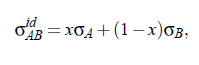 here A , B denote the components and x the mole fraction (x = x_c) at critical composition. Surface tension data for pure liquids of all components of binary mixtures presented in Table (5.10) have been found in the literature [Dewan R. K., Mehta S. K.; Chemical Monthly Springer (1990) B28 (1935) 119], where for every component the surface tension of four temperatures is listed. Values at temperatures between the tabulated ones could be obtained by linear interpolation with an error of less than ±0.02 mN/m. Taken into account the critical temperature of a mixtures as well as using the last equation the surface tension σ_id has been calculated, Table (5.10):